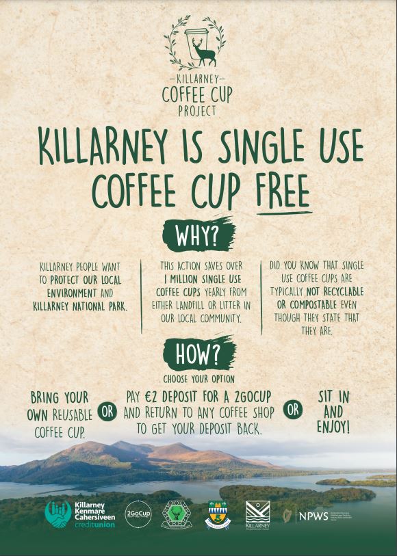 One very successful project, launched in July 2023, has been the Killarney Coffee Cup Initiative. Over 50 local businesses agreed to swap their single-use cups in-store and embrace the 2GoCup Deposit and Return scheme as their option for takeaway drinks. The durable 2GoCup costs 2 Euro which you will get back once you return your cup to a wide range of participating outlets.